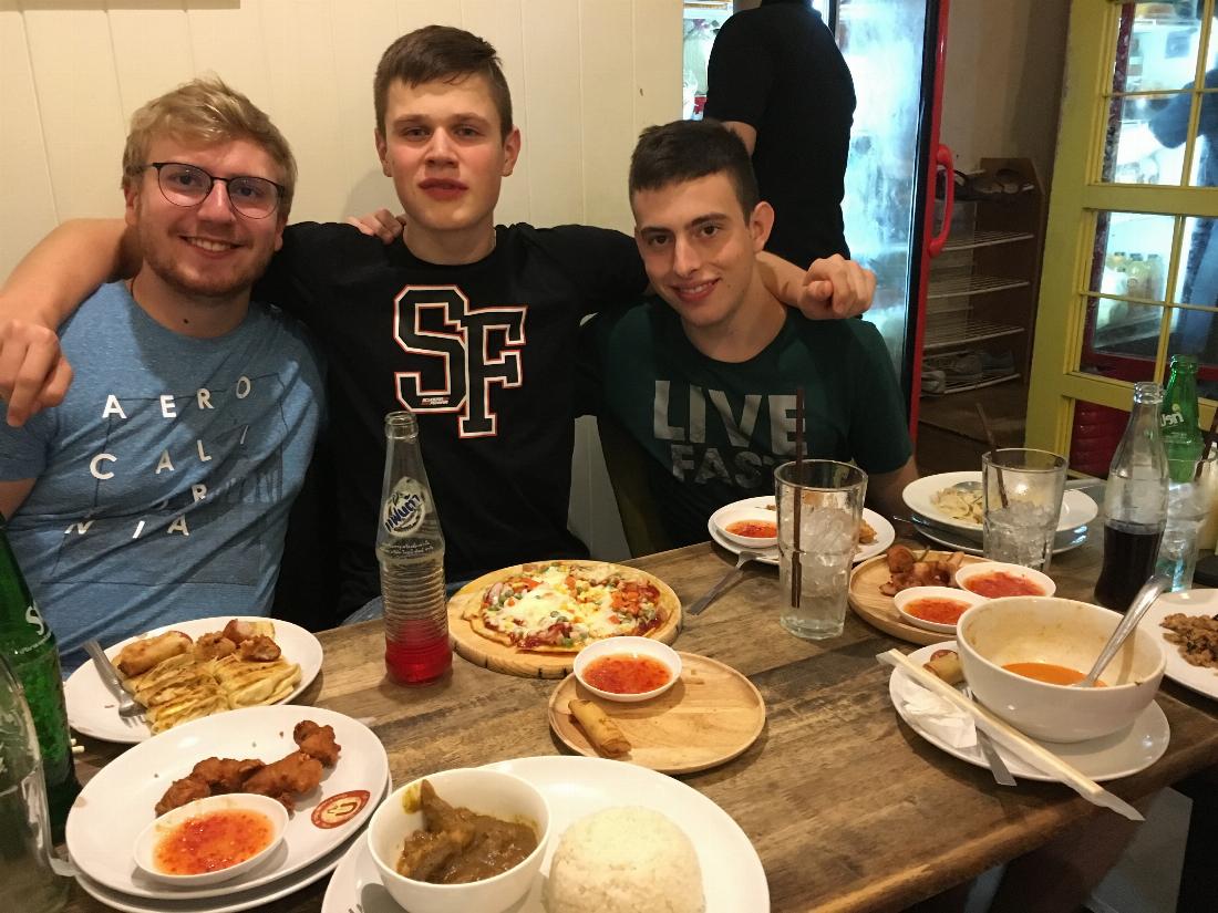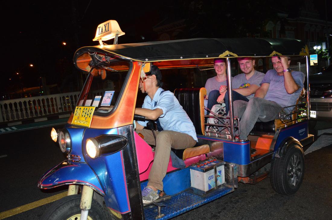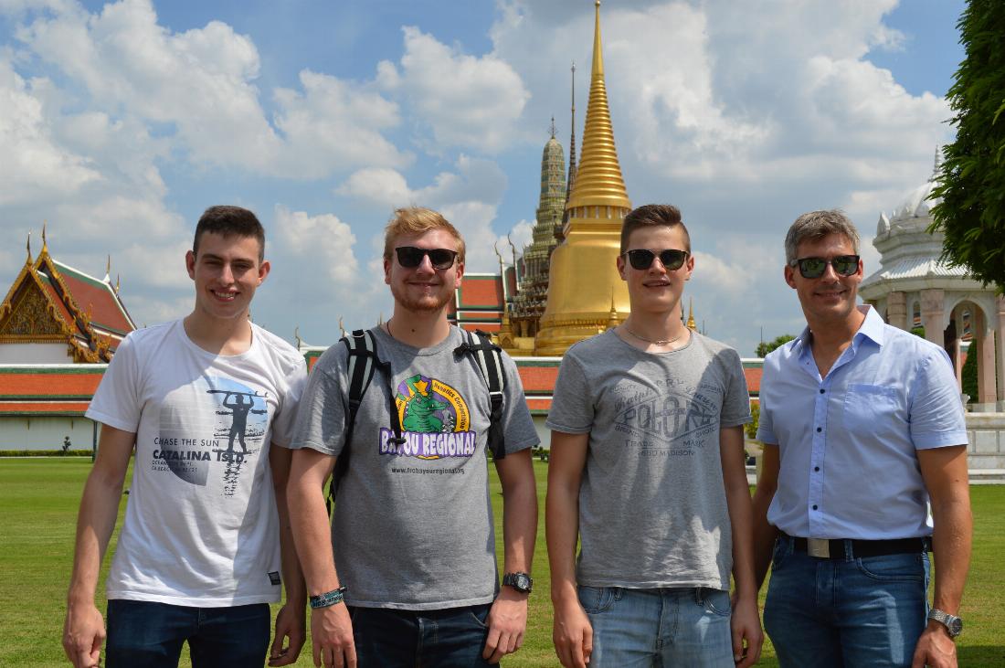 Nach einer intensiven Vorbereitung und einem über 10-stündigen Flug landeten wir im 33 Grad schwül-warmen Bangkok. Somit stand der erste Teil der Reise natürlich unter dem Vorzeichen der Akklimatisierung und wurde neben täglichen Trainings- und Programmiereinheiten deshalb mit kul-turellen und kulinarischen Angeboten Thailands gespickt. Dabei führte uns eine Sightseeing-Tour kreuz und quer durch die Gassen Bangkoks. Das bevorzugte Transportmittel war dabei das soge-nannte „Tuk-Tuk“, eine Mischung aus Rollermotor und einer Sitzbank. Durch diese konnte man sich billig und schnell durch die turbulenten Straßen Thailands bewegen, in welchen die Verkehrsregeln sich auf das Minimum der roten Ampel und der Anweisungen der Polizisten beschränken. Auch eine Fahrt mit einem Longtail-Boot, das stark an die Wasservariante des Tuk-Tuks erinnert sowie eine Be-sichtigung des Königspalastes durfte auf keinen Fall fehlen.