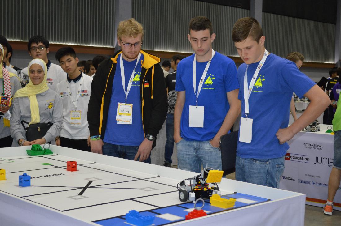 Am nächsten Tag war unsere Anspannung groß. Nach einer erneuten kurzen Einführung in die Wett-bewerbsregeln wurde der Teambereich für die nächsten 9 Stunden abgesperrt. Los ging es dann mit der Verkündung der Überraschungsaufgabe, die wir uns fest vornahmen zu lösen. Die erste Runde war zwar mit 150 Punkten ein solider Einstieg, entsprach jedoch leider nicht ganz unseren Erwartun-gen, sodass wir in der darauffolgenden Bauphase weiter optimierten und Fehler behoben. Die zweite Runde war leider ernüchternd. Aufgrund eines Hardwarefehlers musste der Lauf bereits nach fünf Sekunden abgebrochen werden. Im Folgenden nahmen wir einige kleine Korrekturen vor und fuhren nochmal einige Probeläufe. Die Spannung in der letzten Runde dieses Tages war riesig. Umso größer war die Freude, als der Roboter die ersehnte Maximalpunktzahl erreichte und so die Chance sicherte, einen der vorderen Plätze zu belegen. Nach dieser Achterbahnfahrt der Gefühle bereiteten wir uns auf neue mögliche Überraschungsaufgaben des nächsten Tages vor, um mit den Top-Teams des da-rauffolgenden Tages konkurrieren zu können. Ausgeschlafen nach einer langen Nacht, starteten wir in den letzten und entscheidenden Wettbewerbstag. Doch wie es kommen musste, gelang es dem Roboter im ersten Lauf nicht die volle Punktzahl einzufahren. In der darauffolgenden 30-minütigen Bauphase überarbeiteten wir die Geschwindigkeit an kritischen Stellen des Ablaufes, um mehr Si-cherheit in der Fahrweise des Roboters zu gewinnen. Dann kam der alles entscheidende Lauf. Die harte Arbeit der letzten Jahre wurde belohnt. Der Roboter erreichte wieder im letzten Anlauf die Höchstpunktzahl und damit entschied nur noch die Fahrzeit über die endgültige Platzierung. Klar war bereits, dass wir uns mit der Maximalpunktzahl unter den Top 10 Teams der Welt befanden. Wir la-gen uns in den Armen vor Freude. Nach einer mit Tanz und traditionellen Show eröffneten Siegereh-rung wurden die Plätze der einzelnen Kategorien verkündigt. Dabei erreichten wir den 5. Platz in der Kategorie „Regular Senior“ – ein Erfolg, den wir uns davor nie ausgemalt hätten. Überglücklich zu diesem grandiosen Erfolg ließen wir den Abend gemütlich ausklingen. Nach einer nun etwas längeren Nacht hieß es für uns leider von Thailand Abschied zu nehmen und ab nach Hause ins winterkalte Deutschland zu fliegen.